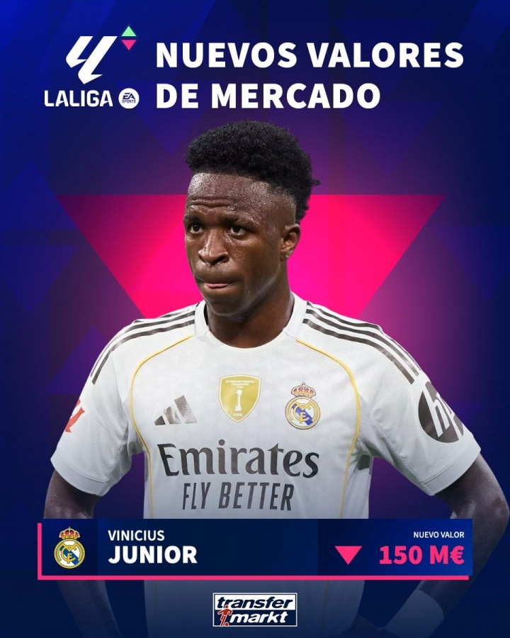 Mười người chơi hàng đầu ở La Liga, chỉ có Vinicius và Rodrigo đã thay đổi, người trước đã giảm 20 triệu và sau đó giảm 10 triệu.