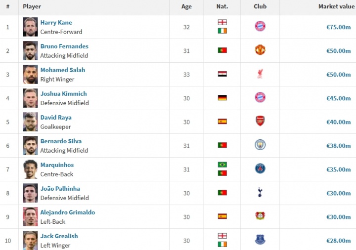 1. Kane, 32 tuổi, Bayern, 75 triệu euro